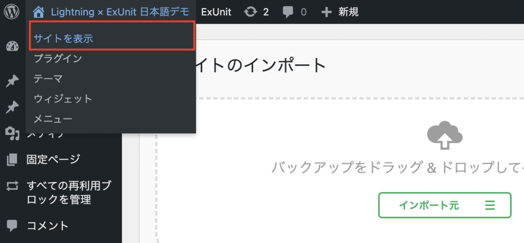 - お試し環境が気に入った場合、エクスポートして保存・ご自身のWordPressサイトにインポートも可能です。詳しくは下記 「お試し環境をエクスポート・インポートする手順」をご参考ください。