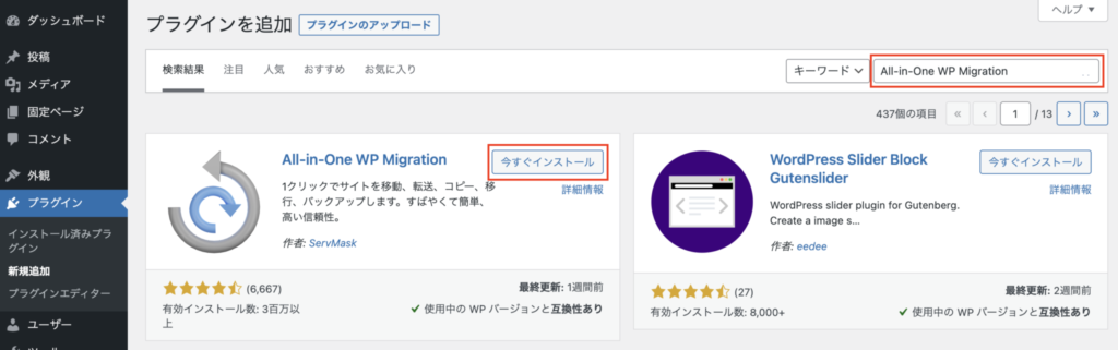 ダッシュボードの【プラグイン】>【新規追加】でキーワードに【All-in-One WP Migration】と入力しインストール後、有効化してください。