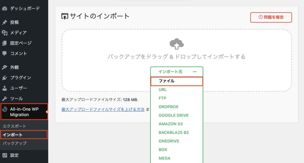 - 【 All-in-One WP Migration 】>【インポート】画面を開く