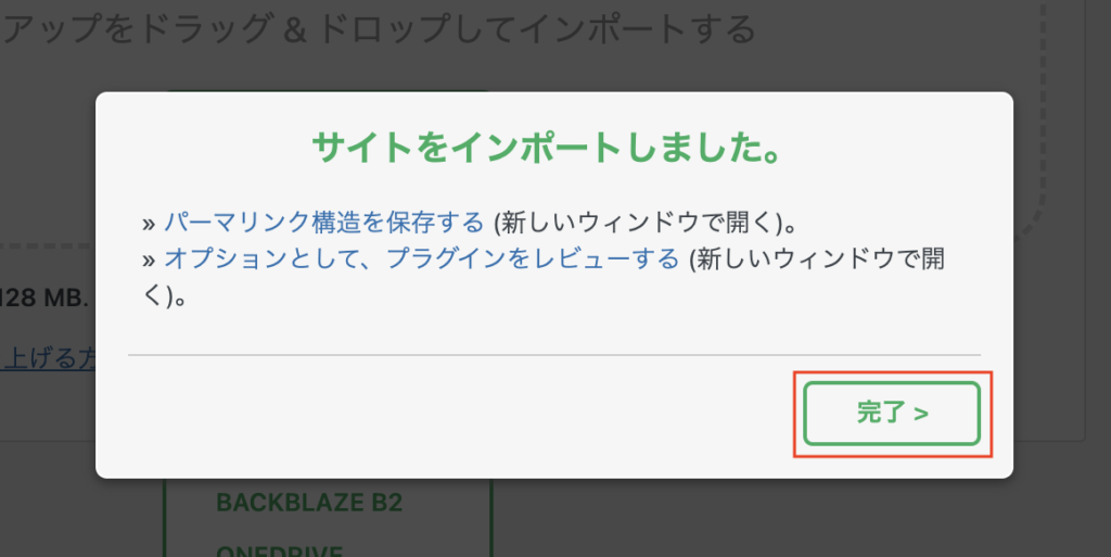 インポートが完了すると「サイトをインポートしました。」と表示されます。「 完了 」をクリックします。