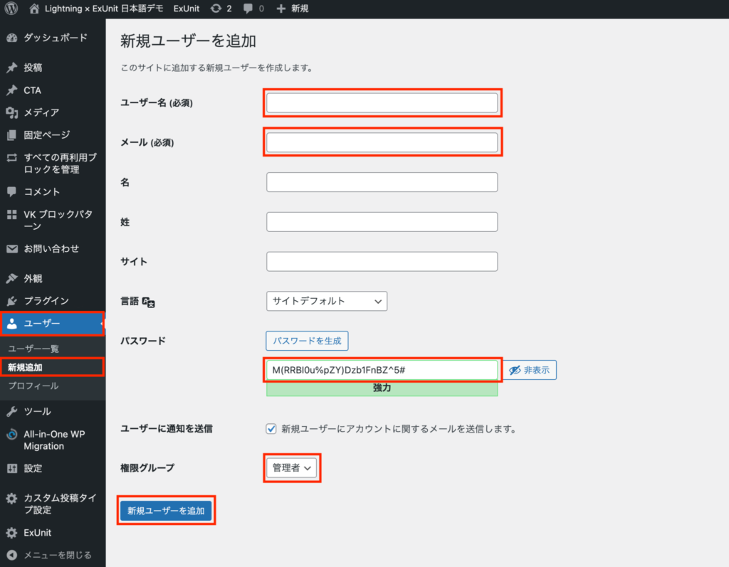 管理画面【 ユーザー 】>【新規追加】から、ユーザー名とメールアドレスを設定し、パスワードは自動で生成されていますが、必要に応じて変更してください。権限グループは「管理者」 を選択します。
