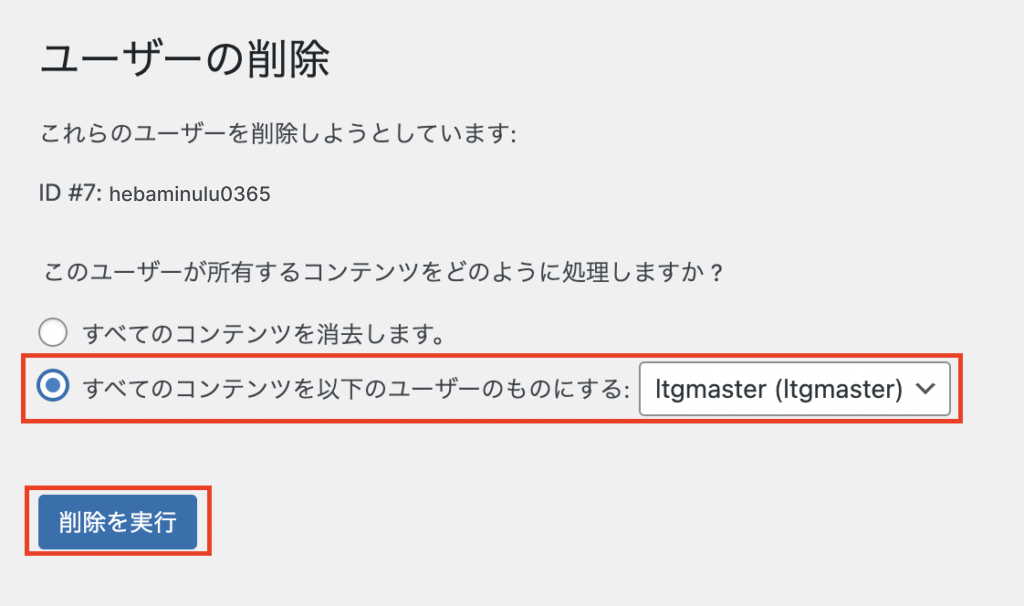 「ユーザーの削除」というページに遷移します。「すべてのコンテンツを以下のユーザーのものにする」にチェックを入れて「削除の実行」をクリックしてください。