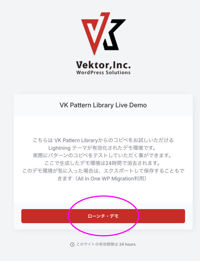 いますぐ無料でブラウザ上にインスタントデモサイトを立ち上げて、パターンライブラリからパターンのコピペとブロックエディターでの即時編集を体験できます。ぜひお気軽に体験してみてください。