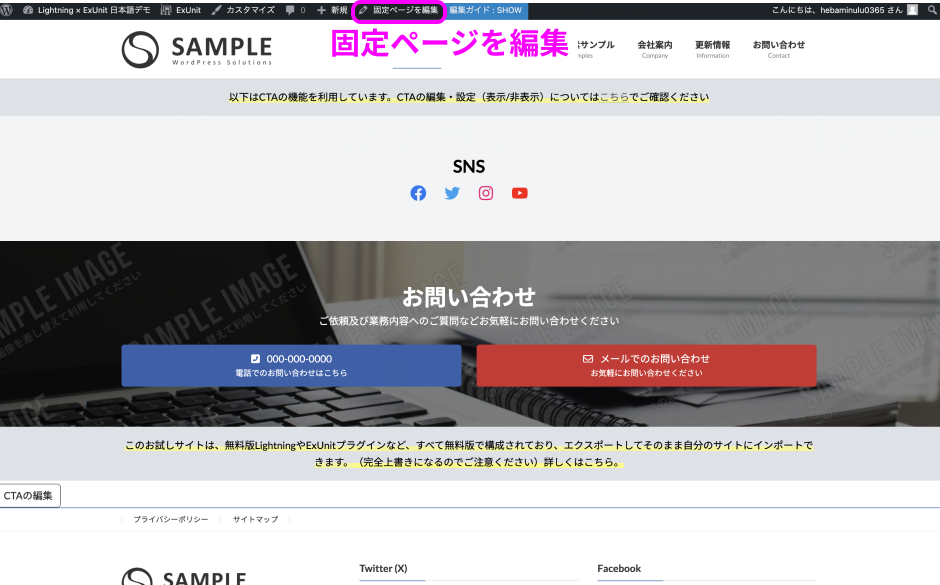 「固定ページを編集」をクリックして、編集画面に移動しましょう。