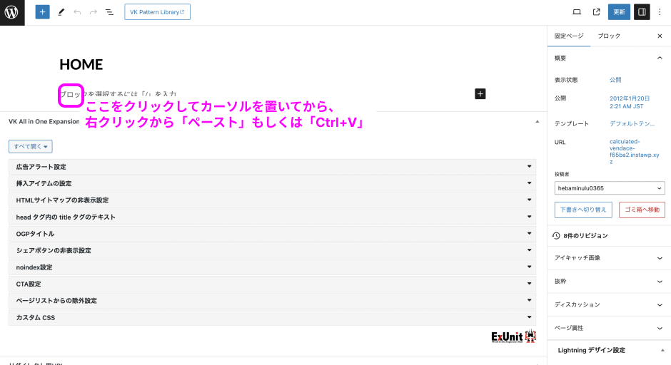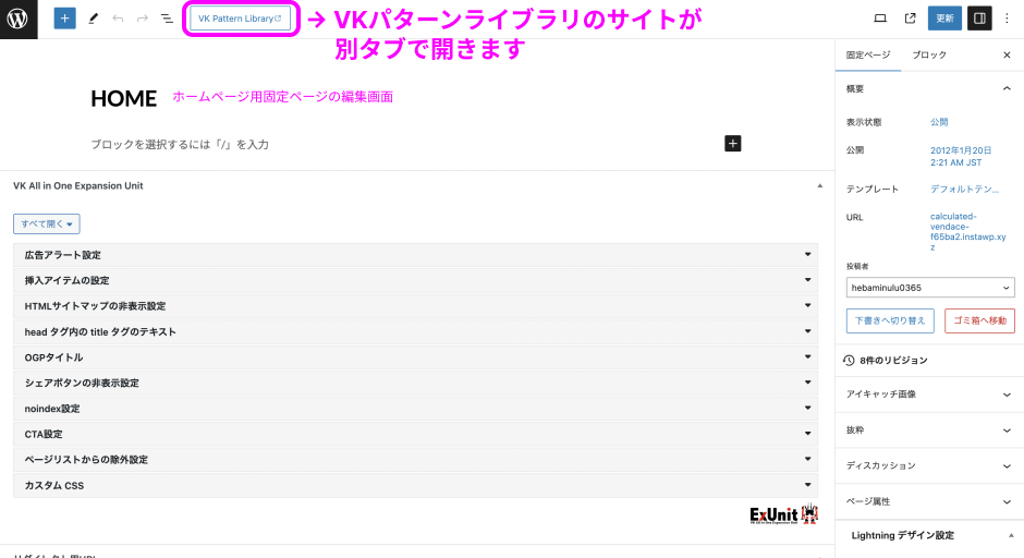 「HOME」というタイトルがついた、ホームページ用固定ページの編集画面に切り替わります。