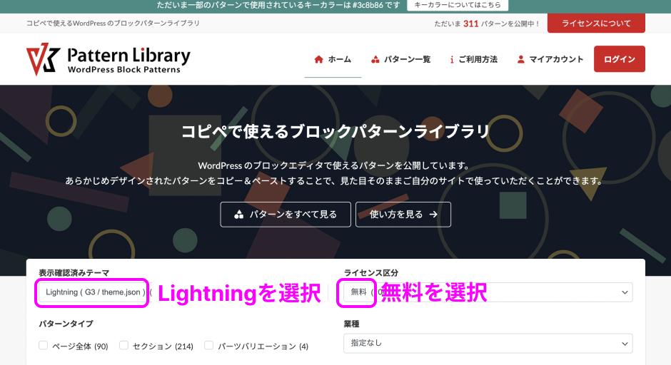上部に「VK Pattern Library」へのリンクボタンがあるので、クリックして別タブに表示させましょう。