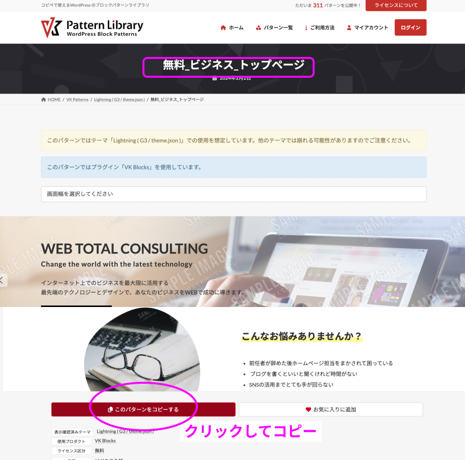 スクロールしてページ下まで移動したら、ページ下部にある「このパターンをコピーする」ボタンをクリックしましょう。