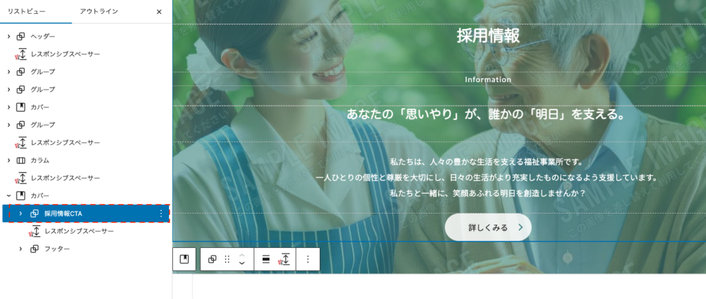 ブロックテンプレートパーツ機能にフッターを設定します。リストビューを開くと「採用情報CTA」という名前のグループがありますので、グループをコピーしてからブロックごと削除します。
