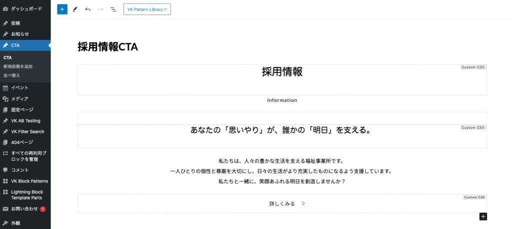 VK All In One Expansion UnitプラグインのCTAで採用情報用のCTAを新規作成します。CTAのタイトルは分かりやすく「採用情報用」などにして、コンテンツ内にブロックを配置したら、下図の「採用情報CTA」部分を削除します。