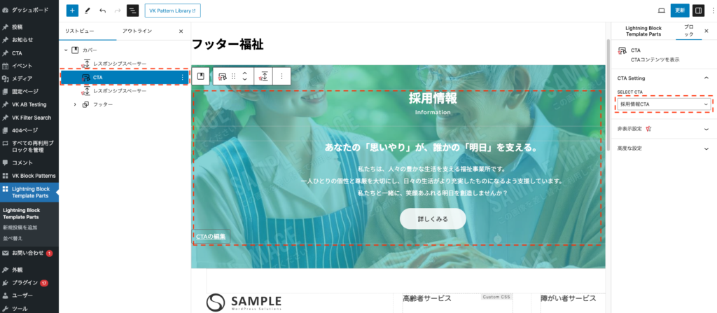 先ほどのSTEP2で設定したCTAを表示するために、CTAブロックを設置します。CTAブロックの設定の「SELECT CTA」から、先ほど作成した「採用情報CTA」を選択します。