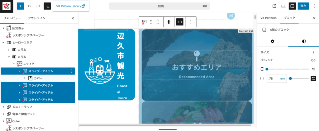 - ヒーローエリアは「カラム」ブロックのカラムアイテムに「カバーブロック」(左側)と「VK スライダーブロック」(右側)を設置しています。「カラム」ブロックに「カスタムCSS」で、「カバー」ブロックの高さを